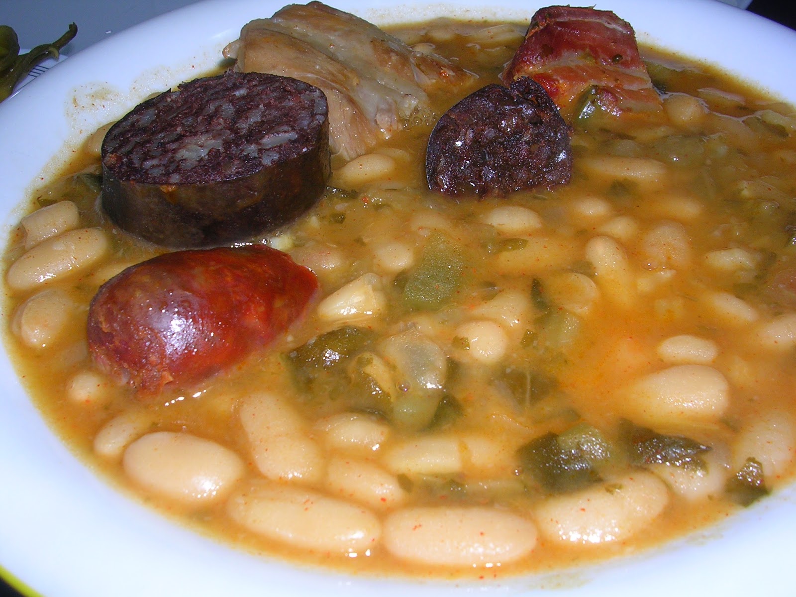 ---Ponemos en una olla-pronto las judías con las carnes, el hueso y el tocino o panceta y el chorizo, NO la morcilla.
